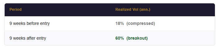 Volatility at 18% annualized is historically low for a commodity that typically runs twice that. That compression is exactly what Regime Signal is designed to read — not a trendless market, but a market coiling. When it broke in late January, it broke hard: 60% realized vol over the following nine weeks, more than three times the pre-entry level. Regime Signal saw the end of the calm coming. Coherence Signal confirmed which way.