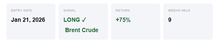 Oil had been drifting lower since mid-2025, and both signals were negative through the end of the year. Nothing unusual. The model was correctly flat while crude was going nowhere useful.