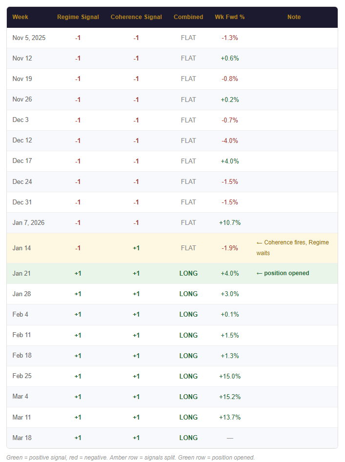 For the position to close, one of the two signals needs to flip negative. Regime Signal typically moves after a sustained multi-week reversal disrupts the longer-term trend. Coherence Signal moves faster — it breaks when the short and medium-term picture starts pulling in different directions.