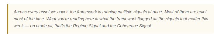 Copper was long alongside oil all through this period — both signals positive, full allocation. This week Regime Signal flipped negative on copper while Coherence Signal held. The combined reading went to flat. Position closed.