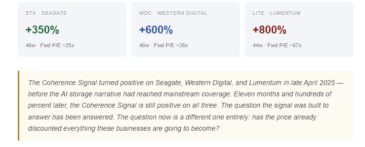 In late April 2025, Seagate and Western Digital were still being priced as commodity hard disk drive manufacturers. The market had not connected the dots between AI training infrastructure and storage demand. The Coherence Signal turned positive on both names on April 30th — emerging from a selloff, against a backdrop where the broader market was still recovering.