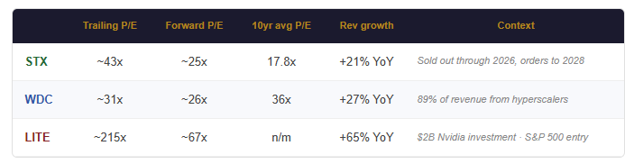 STX and WDC’s forward multiples leave room for the structural story to keep compounding — if the purchase orders through 2028 hold and revenue growth sustains. LITE’s forward multiple of roughly 60x leaves very little room for execution to slip. If the $2B quarterly target takes 30 months instead of 18, or if the optical transition timeline stretches, the multiple compresses materially before the earnings arrive.