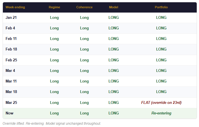 Two days ago we exited our oil position, overriding a maximum-positive model signal. The reasoning was scenario-based: the risk premium embedded in Brent at $110+ was carrying tail-heavy, asymmetric downside on any de-escalation move, and the base-case fair value in our scenario framework sat considerably below spot.