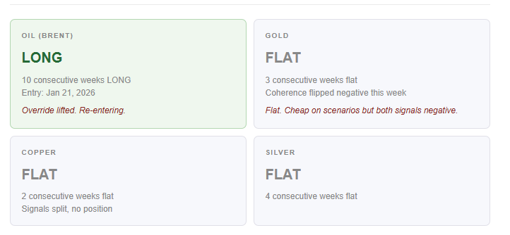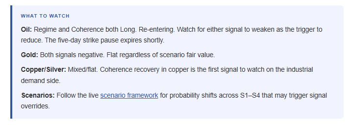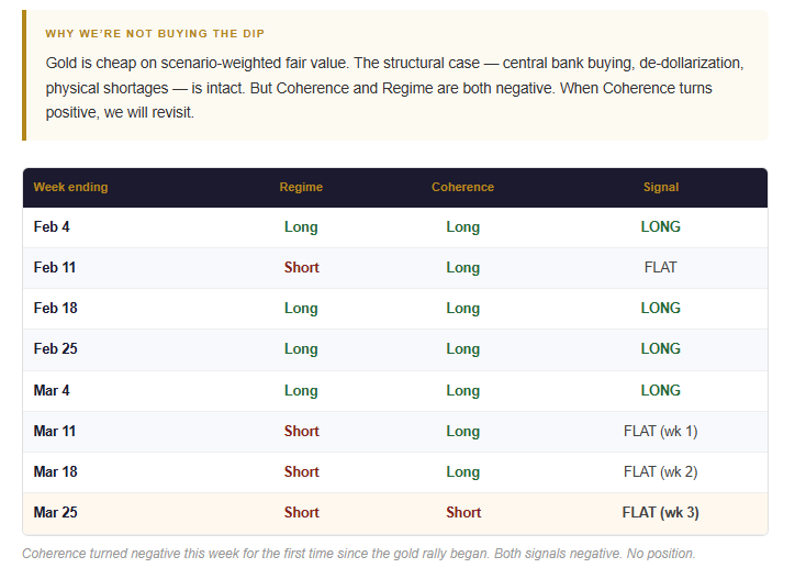 The Coherence Signal turned negative on gold this week — the first time since the rally began. The Regime Signal has been negative for three weeks. Both are now at −1, composite −1.00. The model is saying the price structure has broken down. Buying a cheap asset that is trending down requires a catalyst. We don’t have one yet.